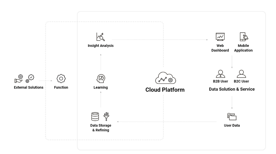 HL Klemove는 B2B User, B2C User에게 데이터 솔루션과 서비스를 제공하고 그로부터 창출되는 User Data를 데이터 스토리지에서 재가공합니다. 그렇게 재가공된 데이터를 통하여 클라우드 플랫폼, 빅데이터 분석 및 AI 기술을 개발합니다. 해당 데이터로 부터 분석된 인사이트를 다시 B2B, B2C User에게 제공합니다.