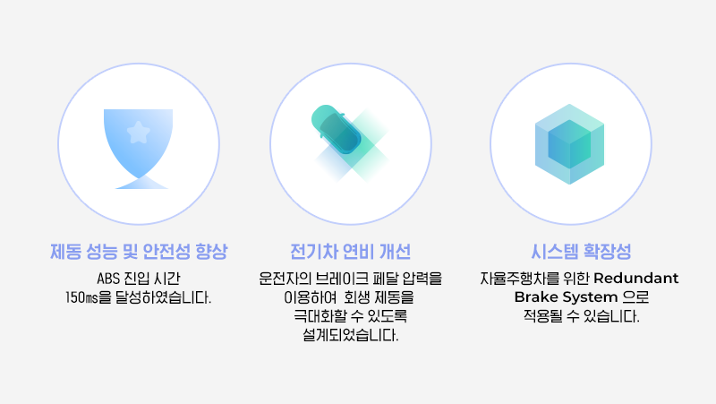 전동 유압 방식으로 자동 긴급 제동에 적합한 향상된 제동 성능을 구현하며, 부품 통합을 통해 중량 및 패키징을 축소하였습니다.