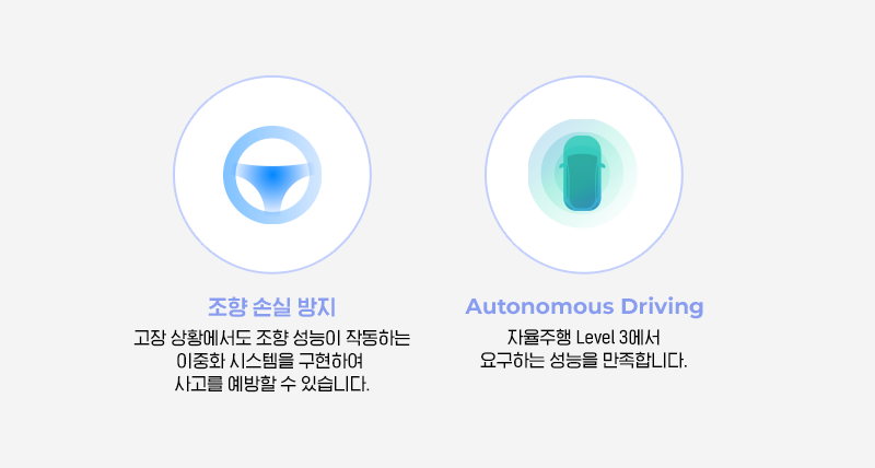 Redundant Steering은 모터와 ECU 이중화 설계를 통해서 유사시 어떤 상황에서도 정상적인 조향 성능을 제공하여 사고를 방지할 수 있는 시스템 (Fail Operational) 이므로 자율 주행에 반드시 필요한 핵심 기술입니다.