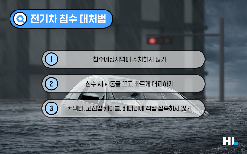 만약 전기차가 침수되면 어떻게 해야 할까요? 가장 좋은 것은 모든 차량이 그렇듯 침수 상황을 만들지 않는 것입니다. 침수 지역을 운행하거나 저지대 등의 침수예상지에 주차하는 것을 삼가야 합니다.