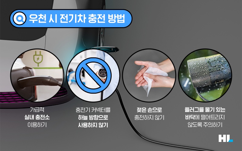 부득이하게 야외 충전소를 사용하게 된다면 충전기 커넥터가 빗물에 노출되지 않도록 하늘 방향으로 두지 않고, 젖은 손으로 충전을 진행하지 않도록 유의해야 합니다. 절연장갑을 착용하는 것도 도움을 줄 수 있습니다. 또한 낙뢰가 내리치는 날에는 충전기를 사용하지 않는 것이 좋습니다.