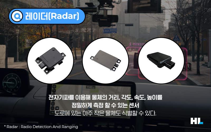 HL클레무브는 근거리와 장거리를 아우르는 레이더 풀 라인업을 구축해 차량의 전면, 측면(코너)과 실내에 레이더를 장착할 수 있게 해 차량 안팎으로 탑승자의 안전을 지키고 있습니다.