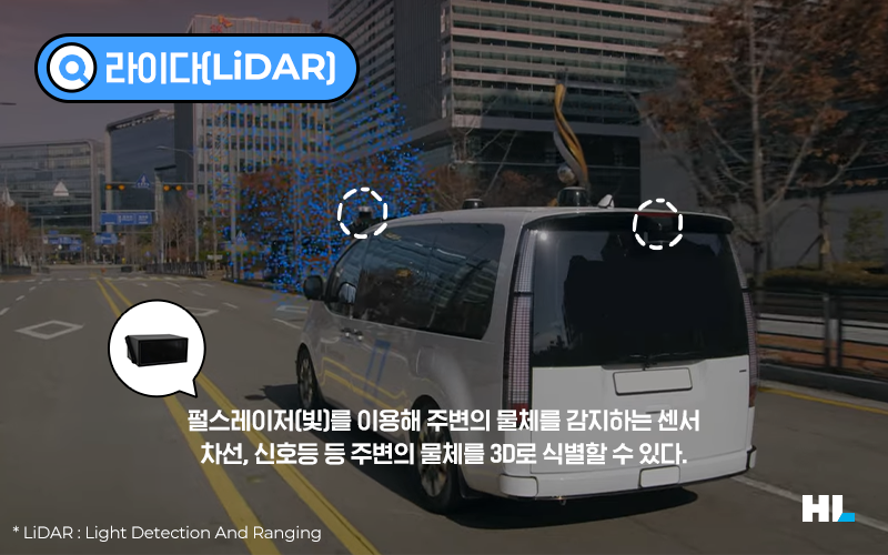 이러한 레이더의 단점을 보완할 수 있는 센서로는 전자파 대신 빛을 이용하는 라이다(Light Detection And Ranging)가 있습니다. 고출력의 펄스 레이저를 쏘아 보내 물체에 반사되어 돌아오는 정보를 분석해 주변 정보를 3D로 인식하는데요. 레이더와 기본 원리는 같지만 사물의 위치와 각도, 거리는 물론 구체적인 형태까지 정밀하게 측정할 수 있다는 점이 가장 큰 장점입니다.