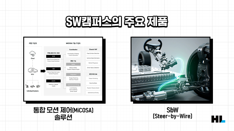 이러한 지원을 기반으로 SW캠퍼스는 미래 모빌리티에 부합하는 다양한 신기술과 제품을 선보이고 있는데요. HL만도 SW캠퍼스의 대표 제품이라 하면 통합 모션 제어(MiCOSA) 솔루션과 스티어 바이 와이어(SbW, Steer-by-Wire)가 있습니다.