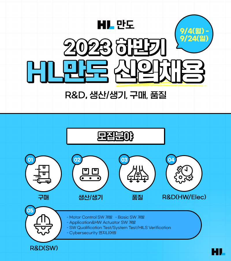 HL만도와 HL클레무브가 모빌리티의 미래를 함께 이끌어갈 인재를 찾는 하반기 채용을 진행합니다. 이번 채용에서는 소프트웨어 중심 자동차(SDV) 부품 개발 관련 분야의 전문 인력을 집중 모집합니다.