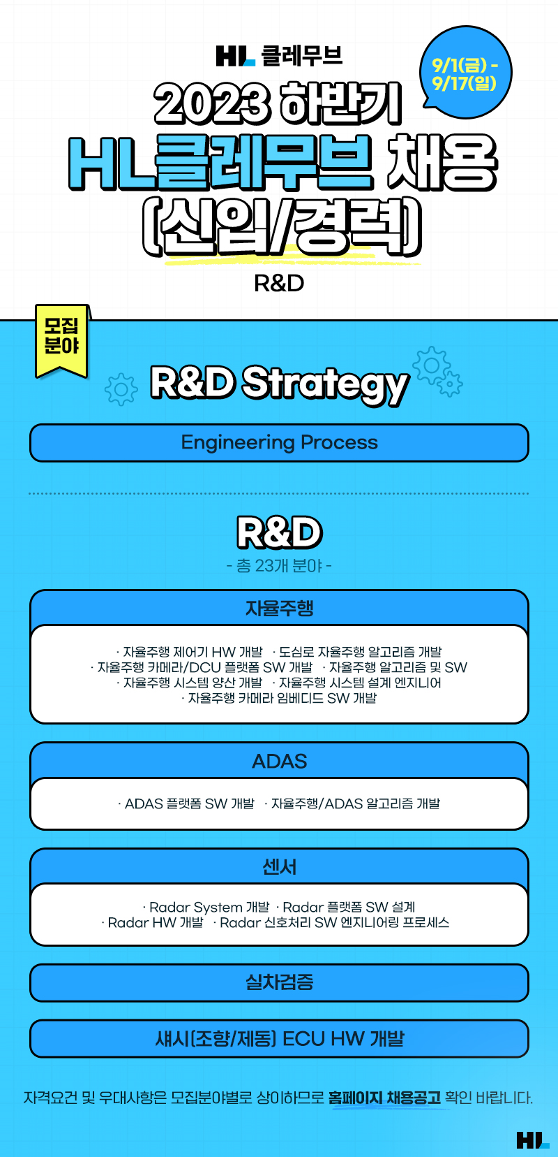 자율주행 솔루션 전문 기업인 HL클레무브는 R&D분야의 신입/경력사원을 채용합니다. 자율주행 제어기 HW개발, ADAS Platform SW개발, Radar System 개발, 자율주행 시스템 양산 개발 등 하드웨어와 소프트웨어 전반에 걸쳐 대규모 인원을 채용할 예정입니다.