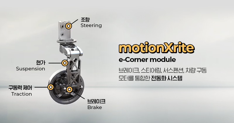 모션엑스라이트는 그동안 ‘e-코너모듈’이라는 이름으로 소개되었는데요. HL만도는 e-코너 모듈이 지향하는 바를 담아 새로운 이름을 지었습니다. 새 이름 ‘motionXrite’에는 사방으로 뻗은 ‘X’처럼 어느 방향이든 움직일(motion)수 있으며, 올바르고 가벼운 움직임(-rite)을 추구한다는 의미를 담았습니다.