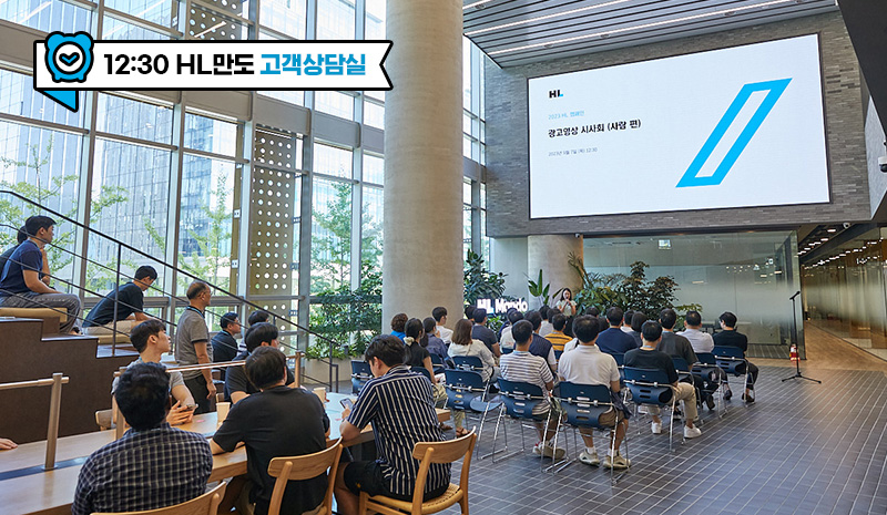 선선한 바람이 불기 시작한 9월의 어느 날, 점심시간에 HL만도 판교 사옥에는 사람들이 삼삼오오 모여들었는데요. 바로 사람 편 공개를 앞두고 HL만도 구성원들의 의견을 듣는 공개 시사회가 진행되었습니다. 광고를 먼저 볼 수 있고, 동료가 출연한다는 소식에 많은 직원들이 시간을 내어 참석했는데요.
