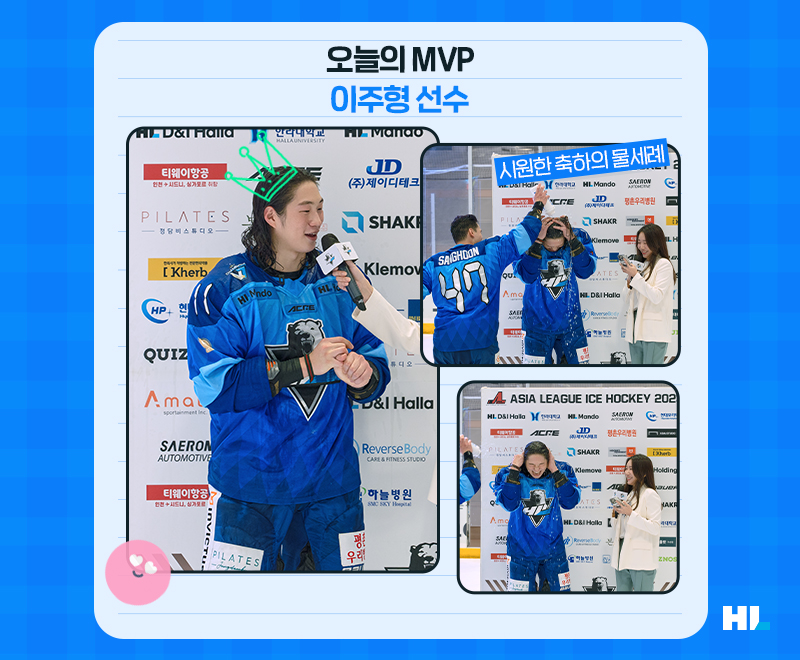 짜릿한 승리로 연승을 만들어낸 선수단! 이날의 MVP는 바로 종횡무진 링크를 누비며 시즌 첫 골을 기록한 이주형 선수가 차지했는데요. 홈 팬들에게 소감을 전하는 이주형 선수에게 부주장 신상훈 선수와 남희두 선수가 시원한 얼음물세례로 축하를 보냈습니다.