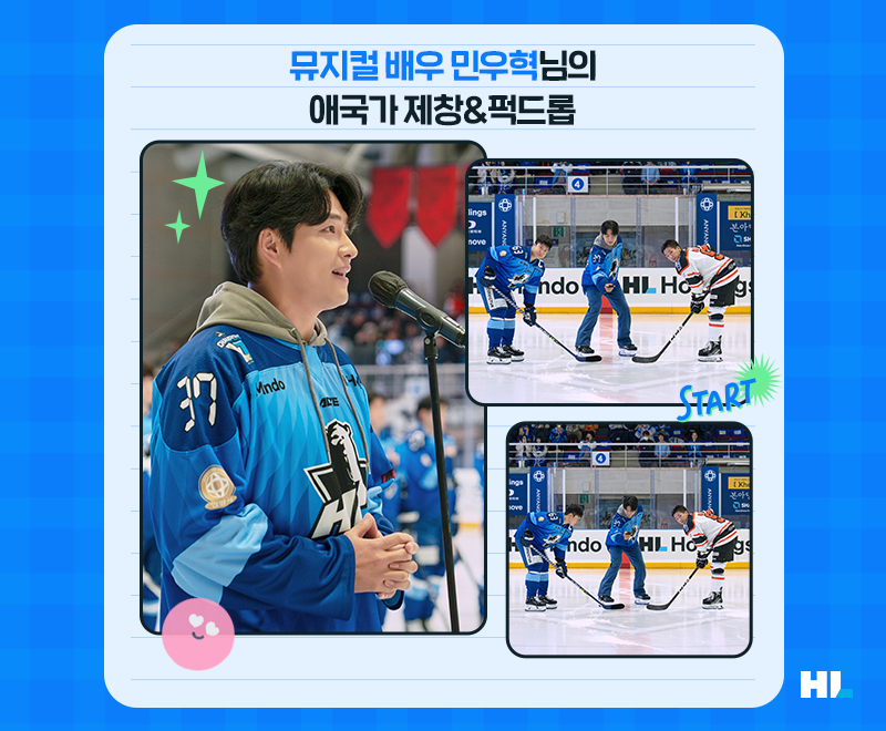 이날 애국가 제창과 퍽드롭에는 뮤지컬배우 민우혁님이 참여했습니다. 민우혁 님은 평소 취미로 아이스하키를 즐기는 것으로도 잘 알려져 있는데요. 설레는 표정으로 “이 자리에 설 수 있어 영광”이라고 소감을 밝힌 민우혁님은 지난 통합우승 현장에도 관중석에서 함께한 HL안양의 ‘승리요정’인데요. 이 날도 멋진 퍽드롭으로 경기의 시작을 알렸습니다.