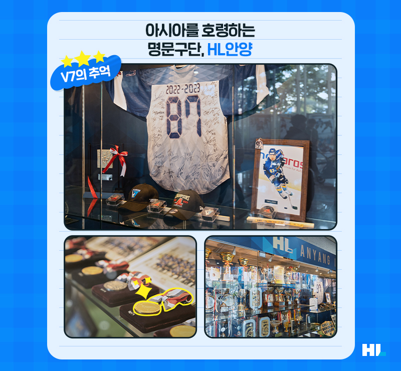경기장의 로비 한켠에는 HL안양이 쌓아 온 영광의 기록들이 자리하고 있는데요. 구단의 긴 역사만큼 트로피와 메달이 전시장을 꽉 메우고 있습니다. 중앙에는 지난 시즌 우승을 기념해 선수단의 사인 유니폼과 우승 기념품이 전시되어 있어 짜릿한 V7 달성을 추억할 수 있습니다.