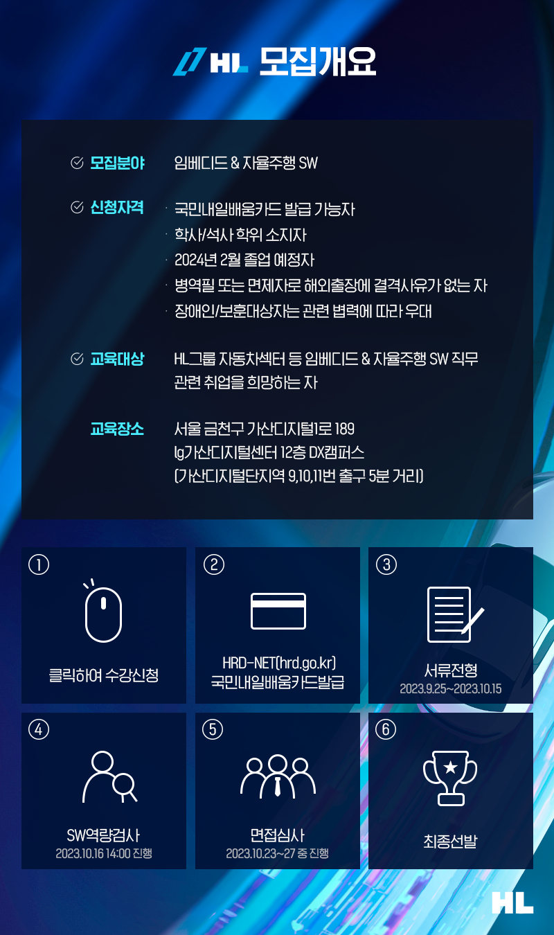모빌리티 SW에 관심있던 취업준비생이라면 이번 교육에 많은 관심과 지원 부탁드립니다. HL은 추후 교육 진행 현장과 클래스메이트들의 이야기를 함께 소개할 예정이니, 많은 기대 부탁드려요!