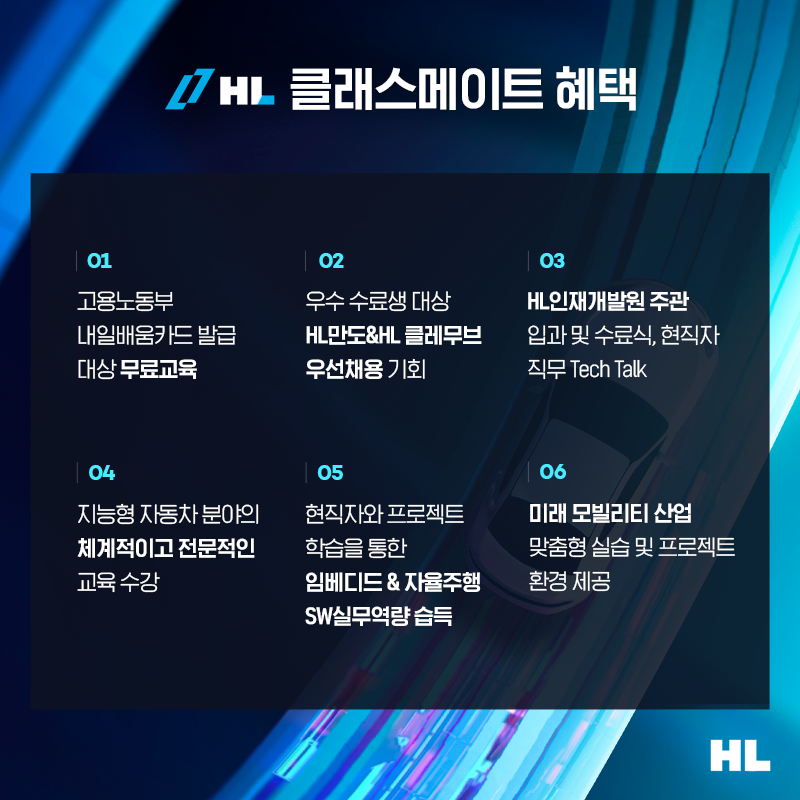 모빌리티 SW에 관심있던 취업준비생이라면 이번 교육에 많은 관심과 지원 부탁드립니다. HL은 추후 교육 진행 현장과 클래스메이트들의 이야기를 함께 소개할 예정이니, 많은 기대 부탁드려요!