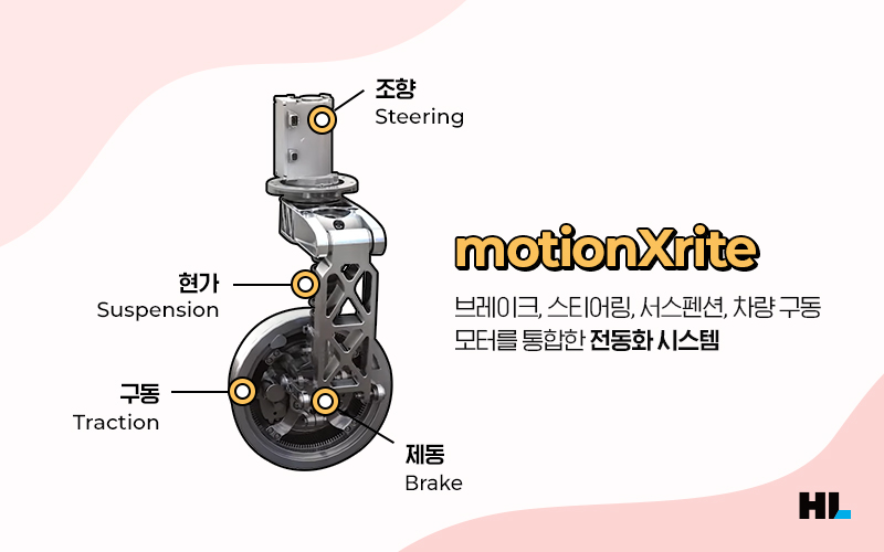 모션엑스라이트는 구동부터 제동, 조향, 현가에 이르기까지 자동차 섀시의 모든 기능을 가진 새로운 시스템입니다. 또한 각각의 휠을 독립적으로 제어할 수 있어 90° 조향과 구동모터를 이용한 ABS(Anti-lock Braking System, 브레이크 잠김 방지 시스템), TCS(Traction Control System) 등의 제동제어 기능을 수행할 수 있는데요. 구동모터를 이용한 제동제어 기능은 제동장치를 단순화할 수 있다는 장점을 가집니다.