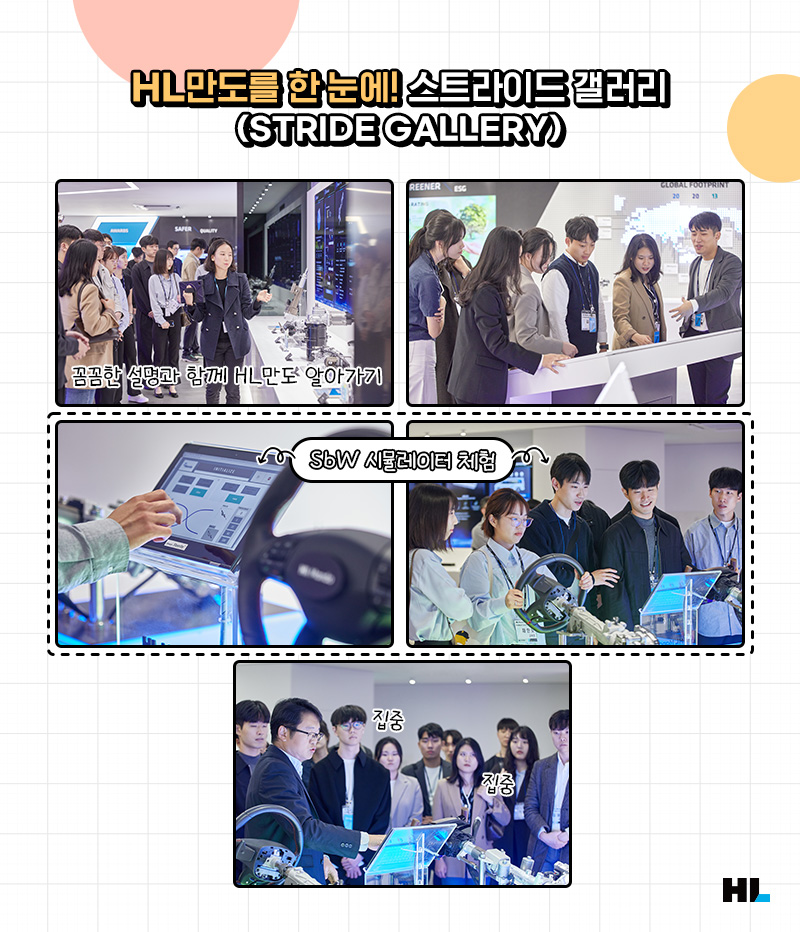 HL만도 스트라이드 갤러리에서는 다양한 부품 실물과 시뮬레이터를 체험할 수 있었습니다. 갤러리를 견학하는 동안 클래스메이트들은 한 마디의 설명도 놓치지 않으려는 듯 눈을 빛냈는데요. 잠시 주어진 자유 견학 시간에도 궁금했던 점을 쏟아내며 배움에 대한 열의를 보였습니다.