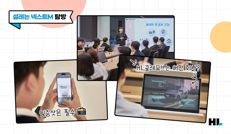 모빌리티 새싹들이 다음으로 향한 곳은 바로 HL클레무브가 자리한 넥스트M과 HL만도의 판교 R&D센터입니다. 회사소개를 비롯한 HR제도 소개를 시작으로 사옥을 돌아보며 사내 시설 탐방과 각 사의 핵심 기술을 전시한 갤러리 투어를 진행했는데요.