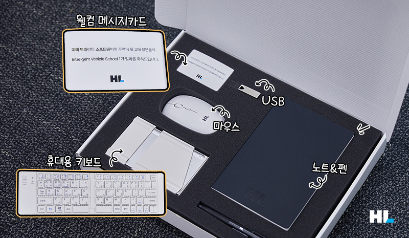 이어 인텔리전트 비히클 스쿨 1기 클래스메이트들을 위한 특별한 선물, 웰컴키트가 공개됐는데요. 웰컴키트는 1기 클래스메이트들의 합격을 축하하는 메시지카드와 교육 기간동안 불편함 없이 수업에 참여할 수 있도록 준비한 물품들로 구성됐는데요. 필기를 위한 기본 도구인 노트, 펜과 함께 무선 마우스와 휴대용 키보드, USB메모리 등 PC 사용이 많은 교육생들을 위해 PC 주변용품을 키트에 담았습니다.