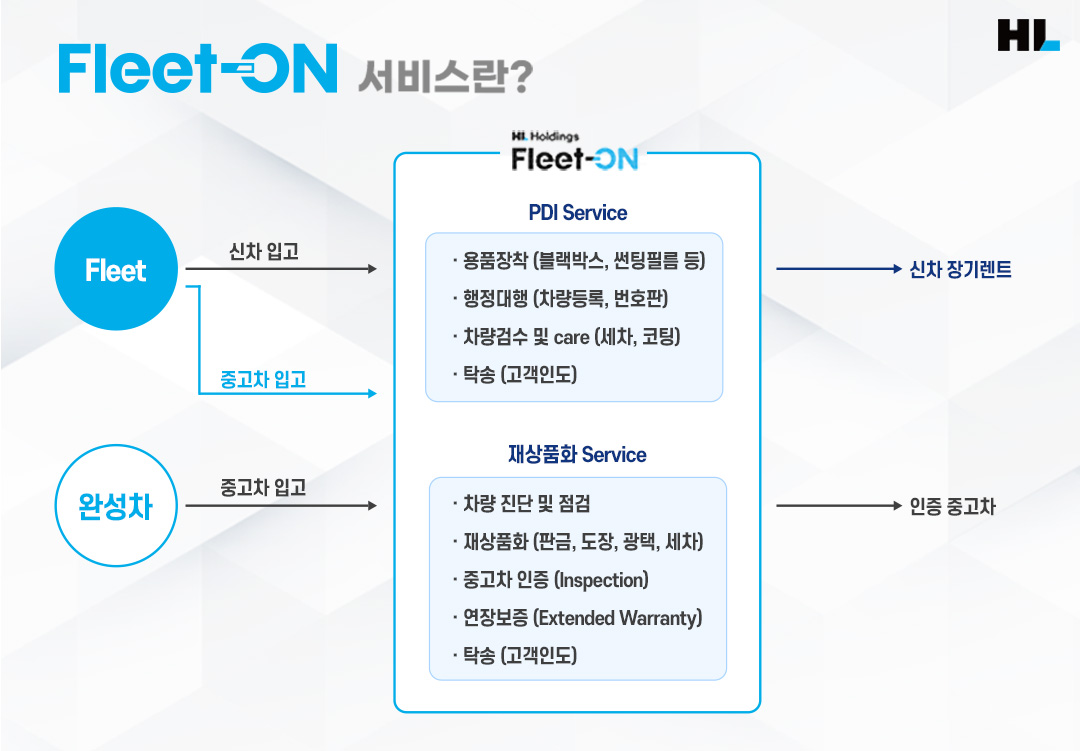 Fleet-ON 서비스는 성능 검사부터 수리, 세차 및 광택, 출고까지 모든 서비스들을 한 곳에서 제공해 Fleet 비즈니스들로서는 HL그룹의 전문적 모빌리티 서비스를 누릴 수 있을 뿐만 아니라 비용적, 운영적으로 이점을 얻을 수 있습니다.