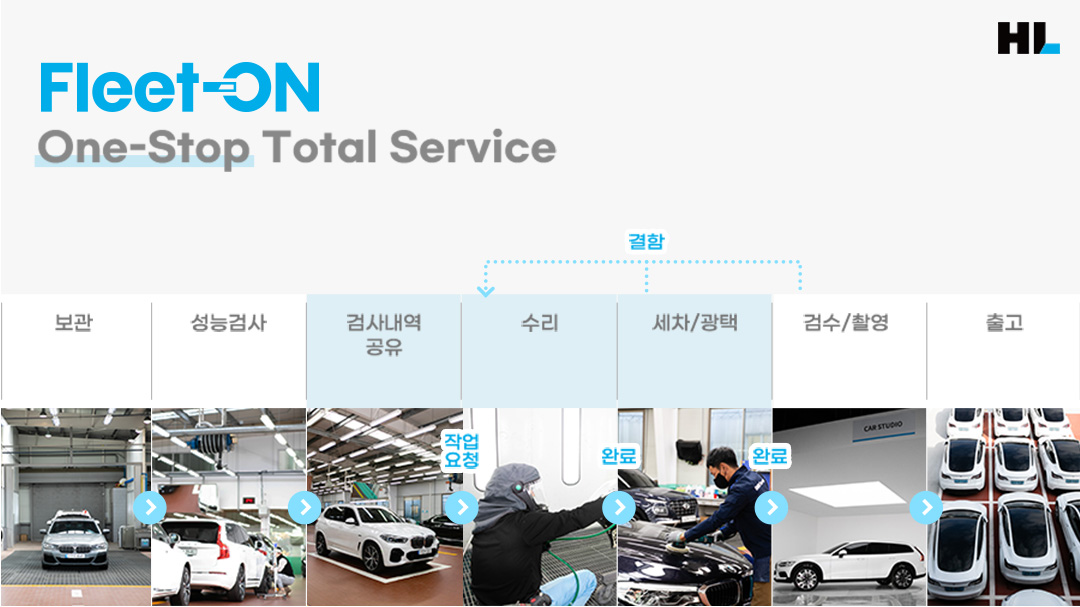 Fleet-ON 서비스는 성능 검사부터 수리, 세차 및 광택, 출고까지 모든 서비스들을 한 곳에서 제공해 Fleet 비즈니스들로서는 HL그룹의 전문적 모빌리티 서비스를 누릴 수 있을 뿐만 아니라 비용적, 운영적으로 이점을 얻을 수 있습니다.