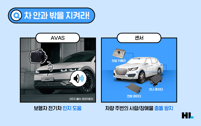 최근에는 자율주행과 전기차 등 저소음차량으로 자동차 트렌드가 변하면서 새로운 안전기술에 대한 논의가 이뤄지고 있는데요. 기존 차량에는 필요 없었던 대표적인 안전장치가 전기차와 같은 저소음차량에 장착된 AVAS(가상 엔진 사운드 시스템, Acoustic Vehicle Alerting System)를 꼽을 수 있습니다. 저소음차량의 AVAS 장착은 보행자 보호를 위해 법제화된 의무사항입니다. 전기차의 장점인 ‘저소음’이 보행자에게는 위험이 될 수 있기 때문에 보행자가 저소음 자동차가 접근하고 있음을 인지할 수 있게 가상의 엔진 소리를 출력합니다.