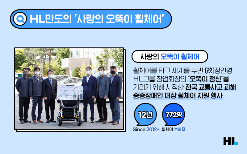 HL만도는 한국교통안전공단과 함께 교통사고 피해 중증장애인을 대상으로 휠체어를 지원하는 ‘사랑의 오뚝이 휠체어’행사를 진행하고 있습니다. 2012년에 시작된 사랑의 오뚝이 휠체어 기증 행사는 휠체어를 타고 전세계를 누비며 경영일선을 돌본 (故)정인영 HL그룹 창업회장의 ‘기업 정신’을 기리기 위해 시작되었는데요. 교통사고 피해자들이 ‘재계의 부도옹(오뚝이)’라 불린 정인영 창업회장님과 같이 다시 우뚝 설 수 있기를 기원하는 마음으로 12년째 이어오고 있습니다.