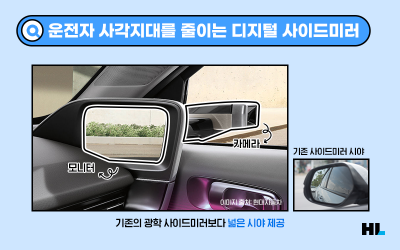 기존 부품/시스템의 단점을 보완하는 방법도 있습니다. 최근에는 여러 양산차에서 디지털 사이드미러를 옵션으로 제공하고 있는데요. 사이드미러를 카메라와 모니터로 제공하는 디지털 사이드미러는 기존의 광학 사이드미러보다 훨씬 선명하고 넓은 후방 시야를 제공합니다. 즉 운전자의 사각지대가 줄어드는 것인데요. 사각지대가 줄어든다는 건 운전자가 주변 환경을 훨씬 더 정확하게 파악할 수 있다는 것이고, 그만큼 사고의 위험도 줄어들 수 있다는 것을 의미합니다. 또한 주변 환경에 따라 모니터 밝기를 조절하거나, 뒷 차량의 전조등 반사를 줄이는 반사 방지 코팅 등을 통해 보다 편안하게 후방 시야를 확보할 수 있게 돕습니다.