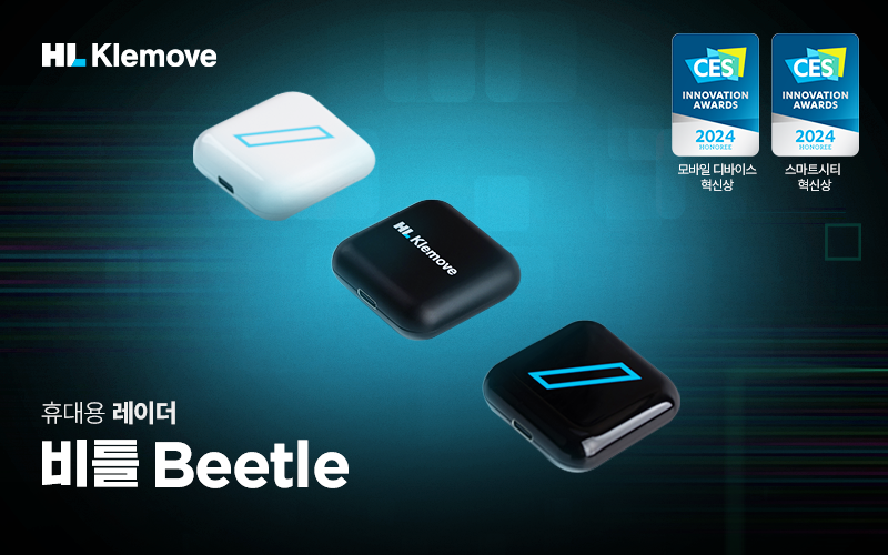 HL클레무브는 모빌리티를 넘어 일상생활까지 적용할 수 있는 두 가지 혁신 제품을 선보입니다. 먼저 '비틀(Beetle)'은 HL클레무브의 차량용 자율주행 레이더 기술을 그대로 녹인 휴대용 레이더로, 모바일 디바이스(Mobile Devices, Accessories & Apps), 스마트시티(Smart Cities) 2개 카테고리에서 혁신상을 받았는데요. ‘내 손 안의 레이더’를 표방하는 비틀은 에어팟 케이스 정도의 작은 크기로, 스쿠터, 전기자전거, 휠체어, 킥보드까지 다양한 모빌리티에 장착할 수 있습니다. 비틀을 장착한 후 모바일 기기에 블루투스로 연동하면 최대 20m거리의 장애물 등을 감지해 위험 상황을 운전자에게 알람과 진동으로 즉시 알려줍니다.