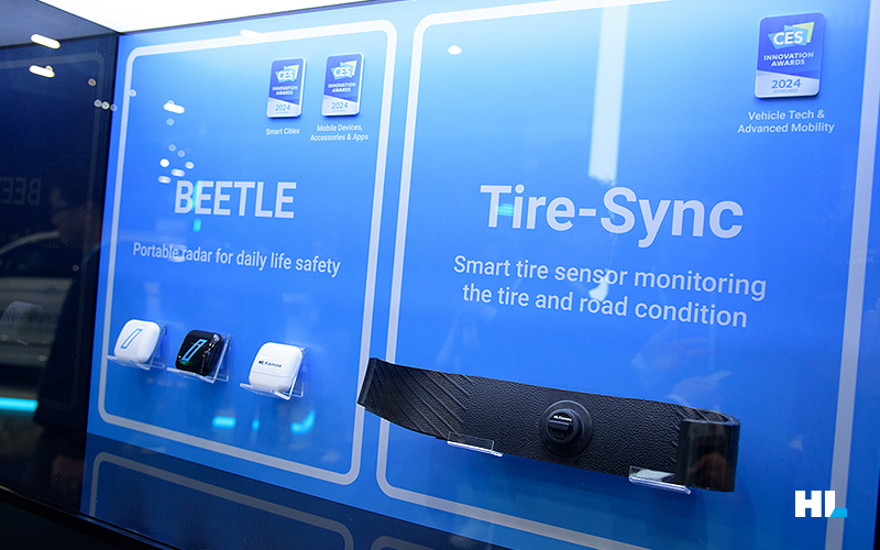 HL클레무브의 전시공간에서는 CES 2024 혁신상을 수상한 또 다른 제품, 타이어·노면 모니터링 센서인 타이어싱크도 확인할 수 있는데요. 타이어싱크는 타이어와 주행 중인 노면에 대한 정보를 수집하고 미래를 예측해 사용자가 보다 편리하고 안전하게 타이어를 관리할 수 있도록 돕습니다.