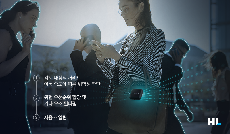 레이더가 오경보를 울리지 않도록 비틀의 알고리즘도 신경 썼습니다. 감지 대상의 거리와 이동 속도를 기반으로 위험성을 판단해 우선순위를 할당하고, 필터링을 통해 복잡한 환경에서도 주변 사람과 위험요소를 분별합니다. HL클레무브는 다양한 유스케이스(Use case) 검증을 통해 비틀 경보의 완성도를 높이는 데 힘쓰고 있습니다.
