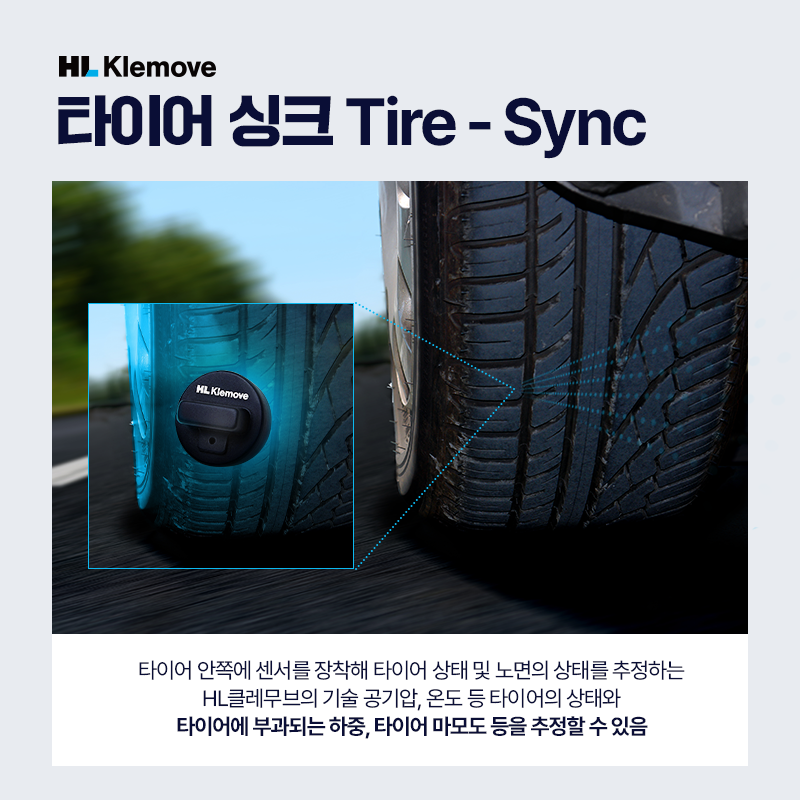 HL클레무브의 타이어싱크는 타이어 내측에 장착된 센서를 통해 타이어의 상태 및 노면의 상태를 추정하는 기술입니다. 기존의 TPMS(Tire Pressure Monitoring System, 타이어 공기압 감지시스템)와 비교해 좀 더 보완된 기술이라고 볼 수 있는데요. 노면과의 유일한 접점인 타이어를 통해 얻을 수 있는 정보들을 분석해 보다 안전한 주행을 돕습니다.