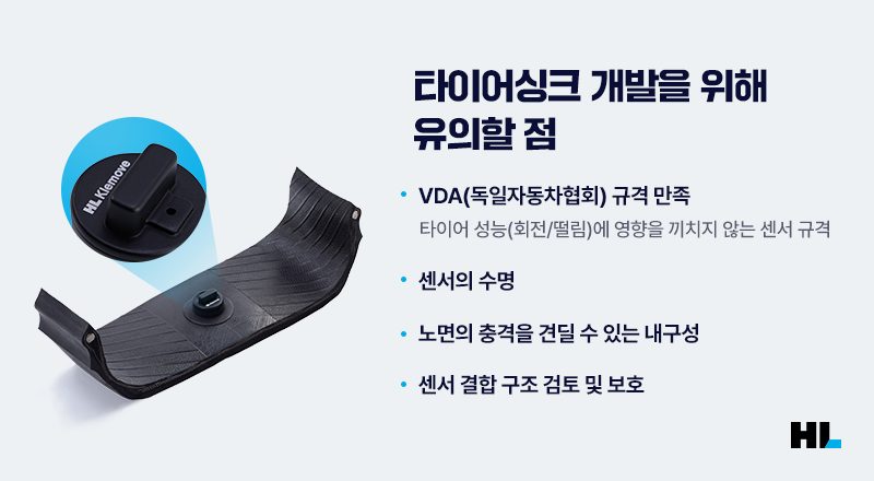 또한 센서를 타이어에 부착한 형태이기 때문에 노면의 충격과 고속 회전을 견딜 수 있는 내구성도 매우 중요한 요소입니다. 특히 센서의 주요 요구 사항으로써 시속 210㎞ 이상의 환경에서도 센서가 정상 동작할 수 있도록 센서 결합 구조 검토 및 보호를 위한 공정을 검토해야 합니다. HL클레무브는 이러한 요구사항을 모두 충족하면서 현실적으로 실현 가능한 방향을 찾고 있습니다.