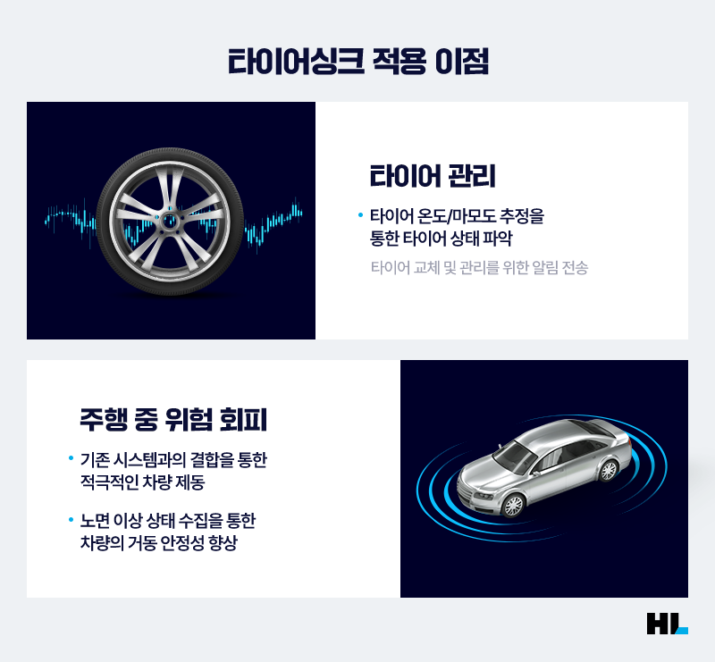 그렇다면 타이어싱크는 앞으로 어떤 분야에서 활약하게 될까요? HL클레무브는 타이어싱크의 활용 범위를 매우 넓게 보고 있습니다. 차량 OEM기업 입장에서는 기존의 TPMS를 대체할 수 있을 뿐 아니라 차량의 거동 및 제어 시스템과 결합해 기존 시스템을 향상시킬 수 있습니다. 특히 긴급 제동 시 타이어 하중 및 마모도를 반영하게 된다면 보다 안전한 시스템을 구축할 수 있죠.