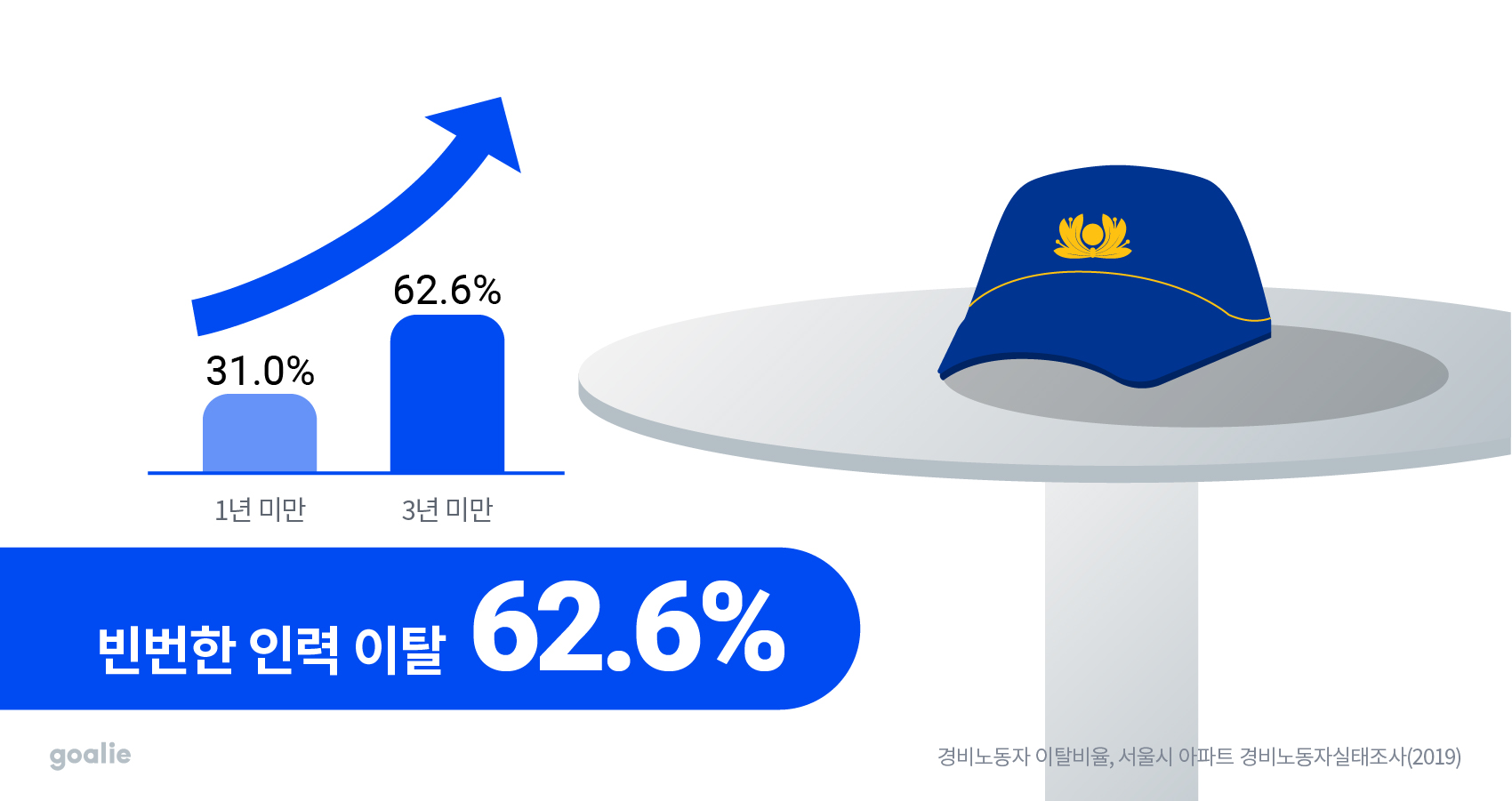 서울시 아파트 경비노동자실태조사(2019)에 따르면, 경비노동자 중 근속 1년 미만인 인력의 비율은 31%에 달합니다. 경비업계에서의 인력 이탈이 얼마나 빈번하게 일어나고 있는지 알 수 있습니다.