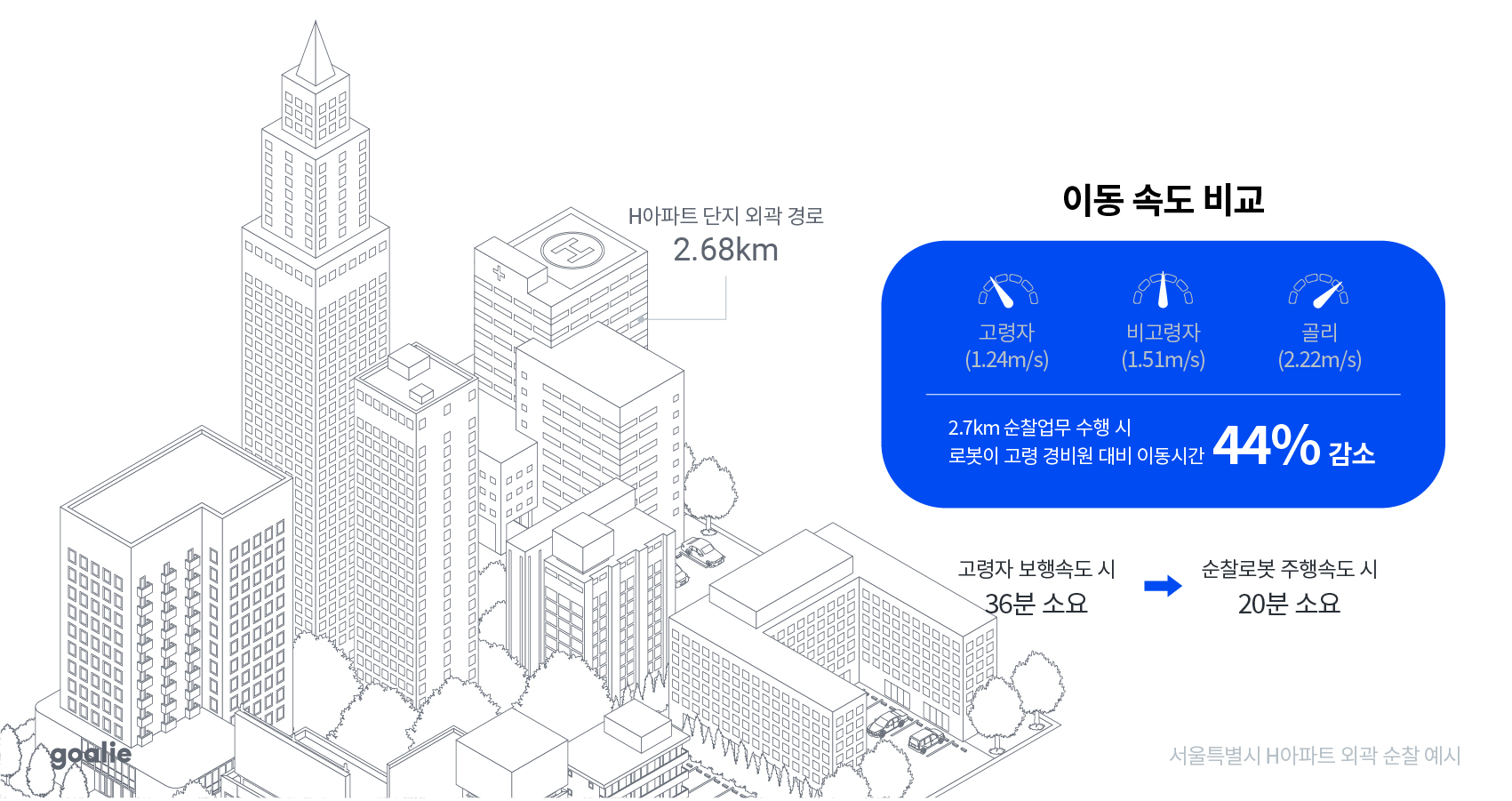 이동 속도에도 변동이 없고 거리가 길어져도 지치지 않기 때문에 장거리 순찰을 진행하더라도 사람보다 더 빠르게 순찰임무를 진행할 수 있습니다.