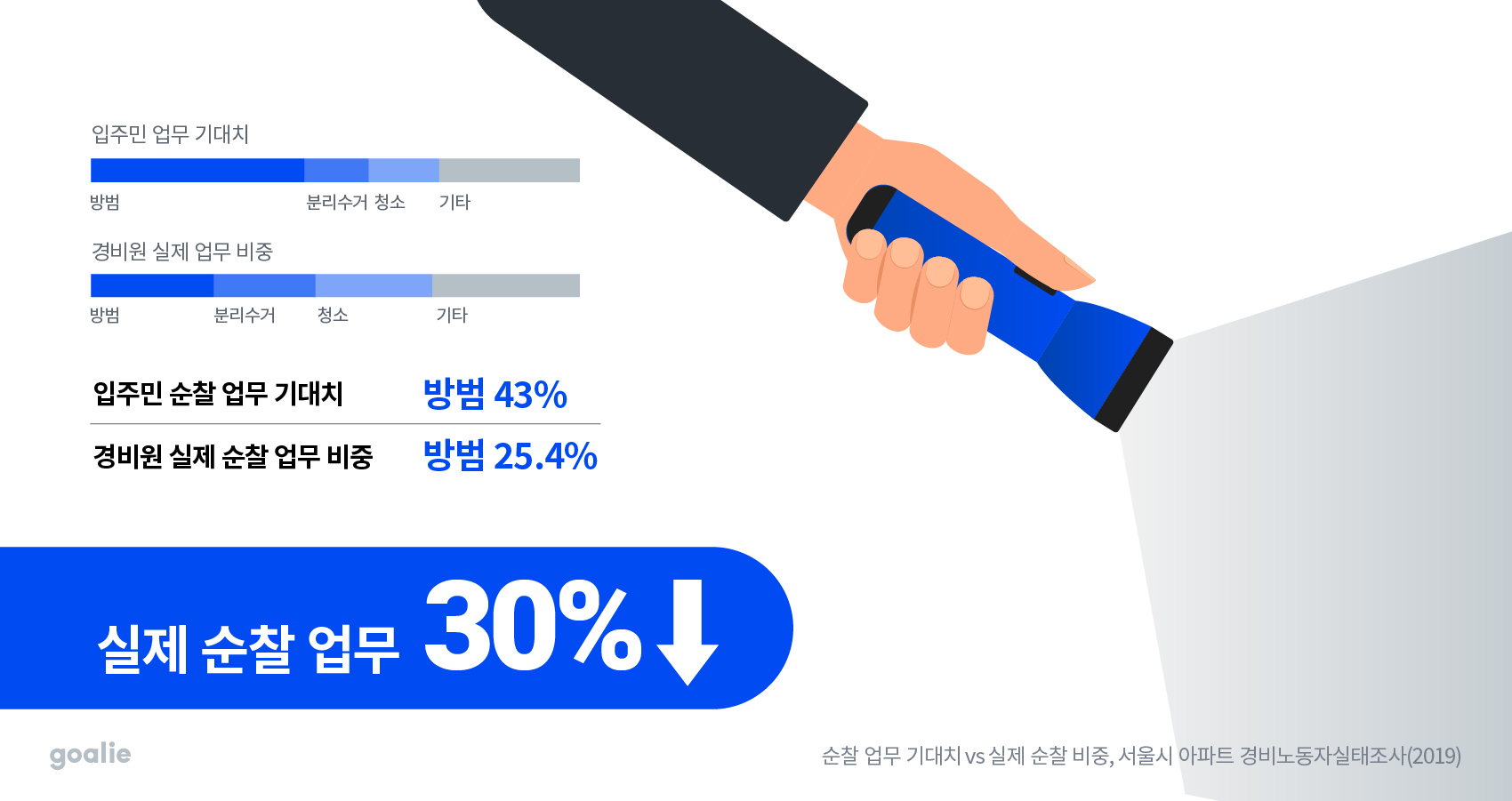 경비 인력 중 80%가 65세 이상입니다. 순찰뿐만 아니라 민원 대응, 인프라 관리 등 다양한 업무들을 동시에 수행해야 하죠. 평균 연령이 높은 경비 인력들의 다양한 업무수행은 피로감과 업무 부담의 증가로 이어질 수 있습니다.
