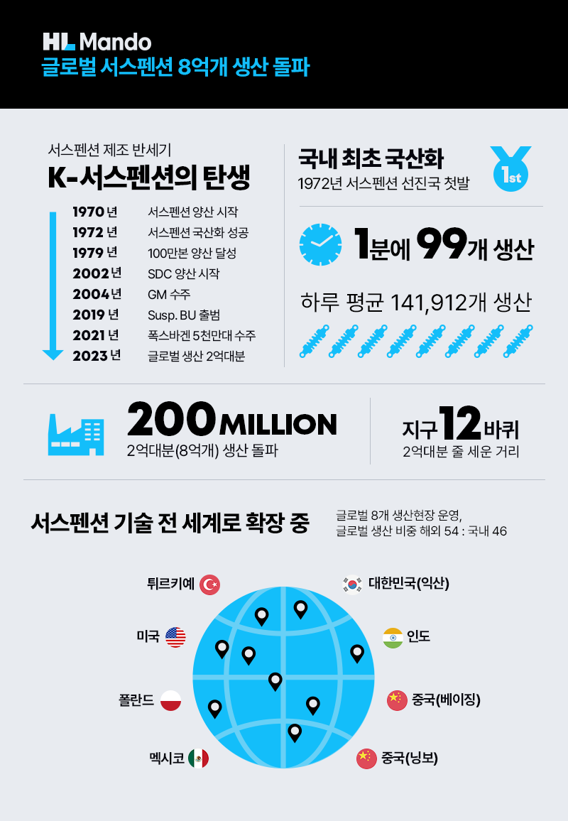 이처럼 세계 각지에서 모두가 힘쓴 덕에 HL만도는 서스펜션 2억대 생산이라는 빛나는 성과를 이룰 수 있었습니다. HL만도는 지금까지의 경험과 성과를 바탕으로 더 큰 성장과 발전을 이루고자 합니다. 이들은 국산 서스펜션 1호를 만든 장본인이자 지난 54년간 숱한 '최초' 기록을 써왔는데요. 또 어떤 멋진 기록들을 함께 써 내려갈지 벌써부터 기대됩니다.