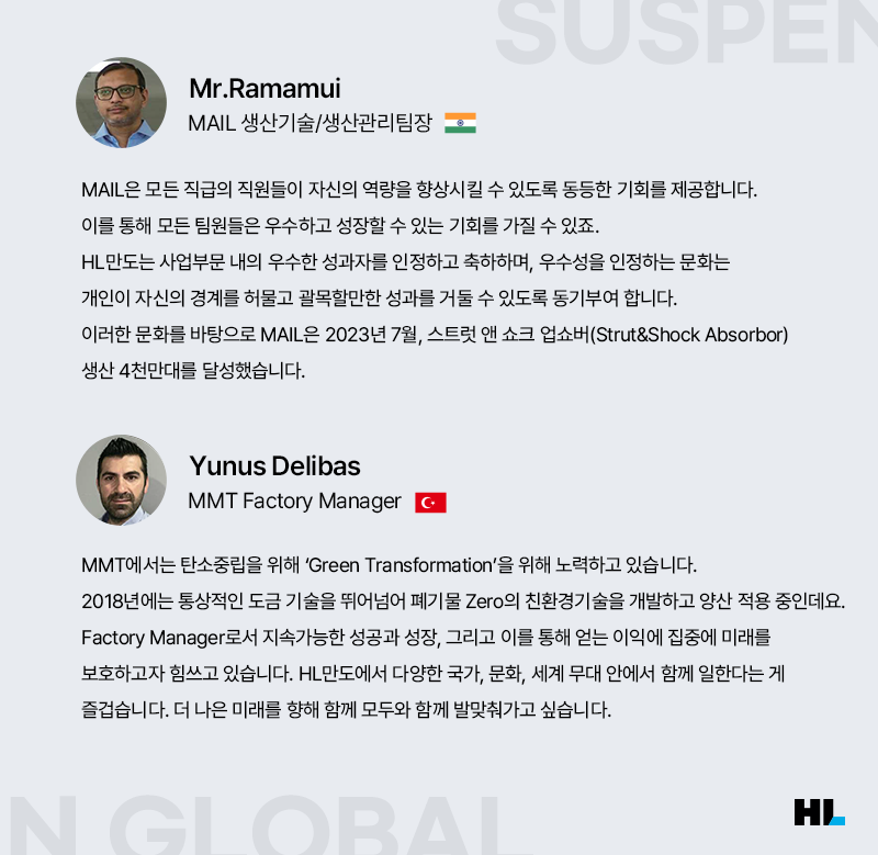 이번 서스펜션 2억대 생산을 기념해 구성원들은 어떤 생각을 가지고 있는지, 또 어떻게 일하고 있는지에 대해 전 세계의 HL만도 Suspension 부문 구성원들의 이야기를 들어보았습니다.