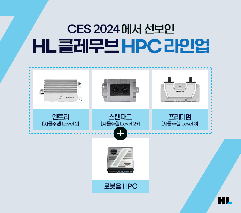 그렇다면 HL클레무브의 HPC는 어떤 제품일까요? 그 정체는 지난 1월에 열렸던 CES 2024에서 확인할 수 있었는데요. HL클레무브는 CES 2024에서 자율주행 레벨에 특화된 고객 맞춤형 HPC 제품 라인업 3종을 공개했습니다.