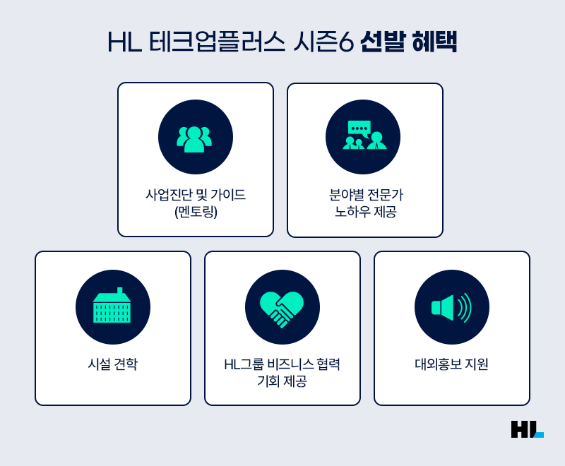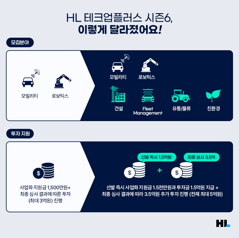유망한 기술 스타트업들을 발굴하는 HL만도 모빌리티 테크업플러스가 여섯 번째 시즌을 맞아 새롭게 찾아왔습니다. 이번에는 HL만도를 넘어 HL그룹 전체가 참여하는 ‘HL 테크업플러스’로 이름을 변경, 모집 분야를 대폭 확대해 더 많은 스타트업을 지원합니다.