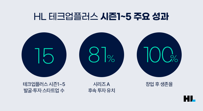2018년부터 시작한 HL 테크업플러스는 지난 다섯 시즌동안 15개의 스타트업을 발굴하고 투자를 진행했습니다. 그 결과 80% 이상의 선발 기업이 후속 투자 유치에 성공했으며, 생존율은 100%를 달성했습니다. 국내 스타트업의 시리즈A 투자 유치 성공 비율이 39%, 5년후 생존율이 33.8%라는 점과 비교하면 놀라운 성과임을 알 수 있습니다.