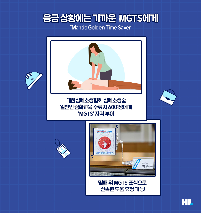 또한 HL만도 원주공장에는 회사 곳곳에 ‘안전 지킴이’를 배치해 두었는데요. 바로 응급 상황 발생 시 골든타임 내에 심폐소생술을 비롯한 즉각적인 조치를 취할 수 있는 60여명의 ‘MGTS(Mando Golden Time Saver)’입니다. MGTS는 대한심폐소생협회의 심폐소생술 일반인 심화교육을 수료한 이들로, 명패 위에 MGTS임을 알리는 표식을 크게 붙여 응급상황 발생 시 신속하게 도움을 요청할 수 있게 했습니다.
