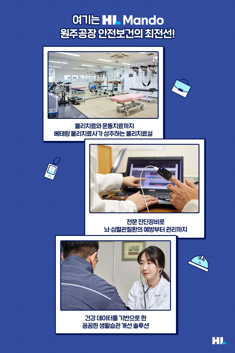 HL만도는 구성원들의 안전한 업무환경을 구축하기 위해 ‘Safer Life, Higher Life’라는 목표 아래 근로자 중심의 안전보건 활동, 환경 중심의 안전보건 활동, 안전보건 문화 체계 활동에 힘쓰고 있습니다. 그 중 오늘 소개할 HL만도 원주공장은 스티어링 장치를 생산하는 HL만도의 주요 사업장중 하나로, 약 790명의 임직원이 근무하고 있는데요. 800여명에 이르는 구성원들이 모두 건강하고 행복하게 일할 수 있도록 보건관리자들이 예방적 보건관리에 힘쓰고 있습니다.