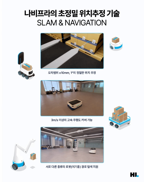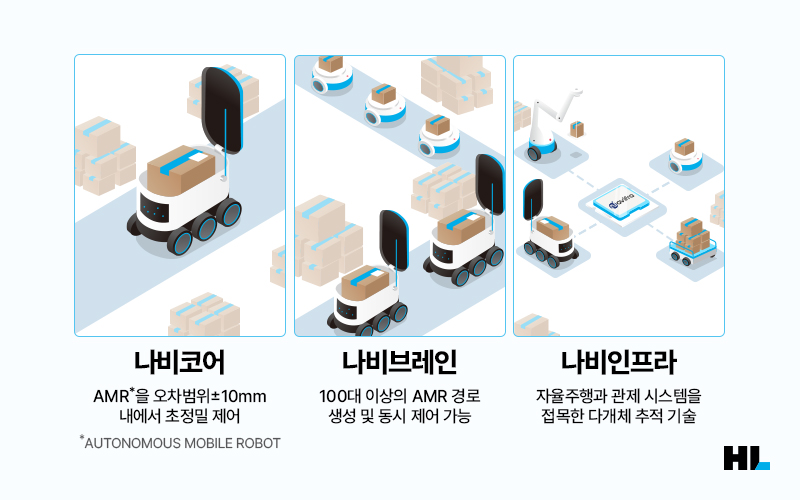 이렇게 나비코어가 탑재된 로봇들은 관제 시스템인 나비브레인(Navi-Brain)시스템으로 서로 연결해 제어할 수 있는데요. 동시에 100대 이상의 로봇을 연결하여 제어할 수 있어 많은 로봇이 운행하는 상황에서도 다른 로봇을 감지, 충돌을 예측하여 이를 피할 수 있는 최적의 경로를 탐색합니다. 마지막으로 로봇의 자율주행과 관제가 잘 이뤄지도록 인프라를 제공하는 나비인프라(Navi-Infra)가 있습니다.