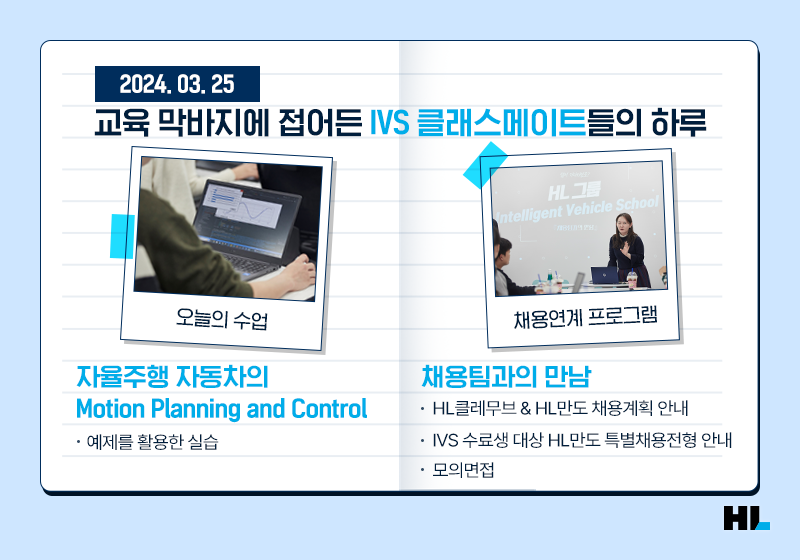 인텔리전트 비히클 스쿨(Intelligent Vehicle School, 이하 IVS)이 2기 수강생을 모집합니다. IVS에서는 어떤 걸 배우는지, 어떤 걸 얻을 수 있는지 궁금한 예비 클래스메이트들을 위해 HL이 준비한 특별한 시간! 바로 지난해 11월에 시작해 지금까지 쉴 새 없이 달려온 IVS 1기 클래스메이트들 모습인데요. 이들의 하루가 어떻게 흘러가는지, 또 누구에게 어떤 내용을 배우고 있는 지 함께 볼까요?
