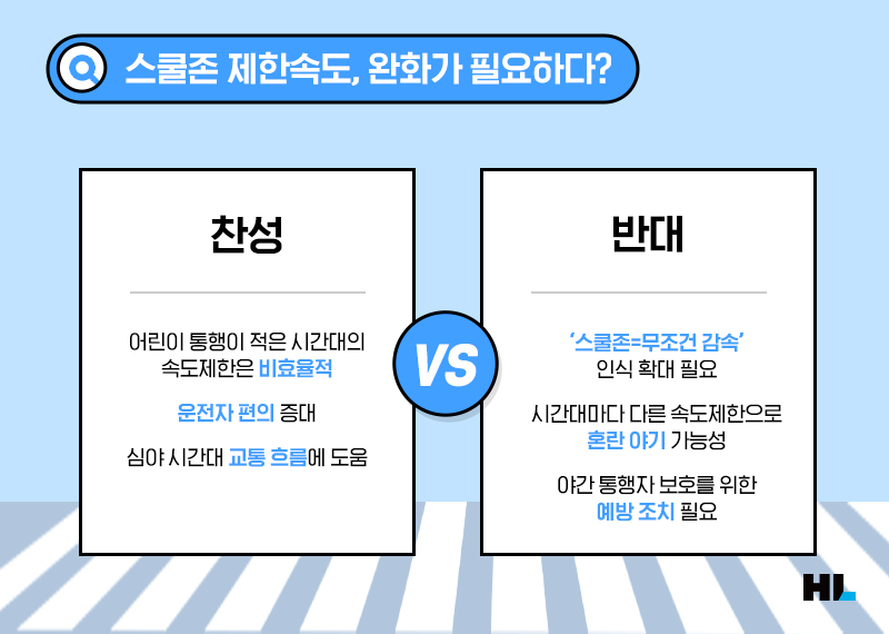 제도의 변화에 대한 사람들의 생각은 어떨까요? 심야시간 스쿨존 속도제한 완화에 대한 찬반 의견은 첨예하게 엇갈리는데요. 스쿨존 시간제 속도제한에 찬성하는 이들은 ‘어린이 통행시간이 적은 시간대의 30㎞/h 제한은 비효율적이다’, ‘(차량의) 통행시간 감소에 도움이 된다’, ‘실제 생활에서 이 정도의 유연함은 필요하다’ 등 편의성과 효율성의 향상을 주된 이유로 꼽고 있습니다.