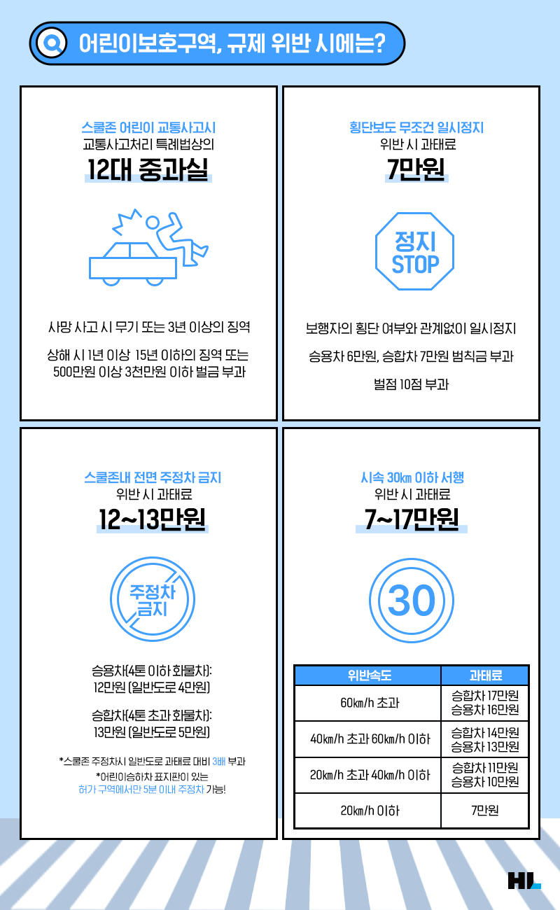 특히 8시부터 20시까지 횡단보도 일시정지 위반, 주정차 위반, 속도 위반 등 어린이보호구역 내 도로교통법 위반 시에는 과태료와 범칙금, 벌점을 일반도로의 2~3배로 적용해 부과합니다. 스쿨존 횡단보도 일시정지 위반 시에는 7만원의 과태료가, 주정차 위반 시에는 12~13만원, 속도 위반 시에는 7~17만원의 과태료가 부과됩니다.