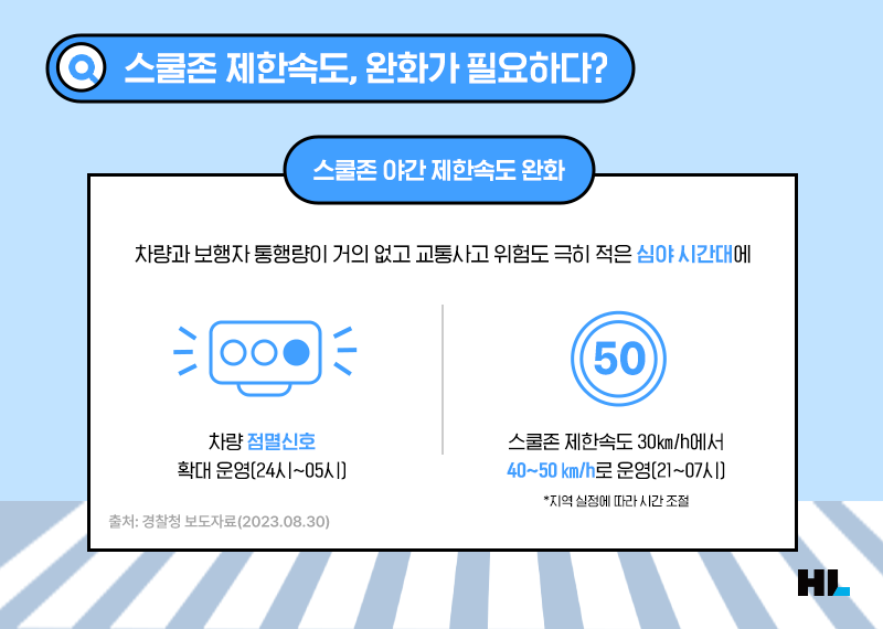 때문에 어린이 교통안전을 저해하지 않는 범위 내에서 규제를 개선해야 한다는 의견이 지속해서 제기되었습니다. 도로교통공단에서 초등학교 교사·학부모 400명과 일반 운전자 400명을 대상으로 진행한 설문조사에서도 어린이보호구역 시간제 속도제한에 75%가 찬성한 것으로 나타났습니다. 이에 지난해 경찰청에서는 보도자료를 통해 어린이보호구역 시간제 속도제한을 시행하겠다고 발표, 일부 지역에서 시범적으로 운영하고 있습니다.