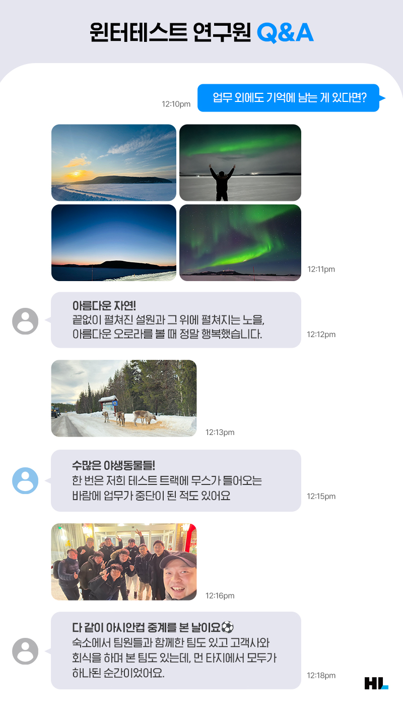 지금까지 윈터테스트에 다녀온 연구원들의 이야기를 들어보았는데요. 열정과 낭만, 감동이 있는 윈터테스트 이야기 어떠셨나요? 내년 윈터테스트에는 또 어떤 일들이 있을 지 기대해도 좋을 것 같습니다.