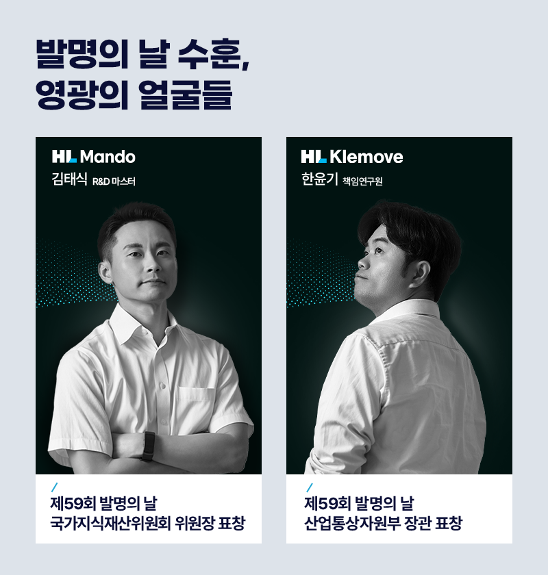 이 세 사람 중 전동화와 자율주행 기술로 미래 모빌리티의 발전을 위해 힘쓰고 있는 HL만도의 김태식 R&D 마스터(이하 태식)와 HL클레무브의 한윤기 책임연구원(이하 윤기)을 만나 발명의 날 비하인드 스토리와 발명의 날 수상까지 이어질 수 있었던 연구개발에 대한 이야기를 나눴습니다.