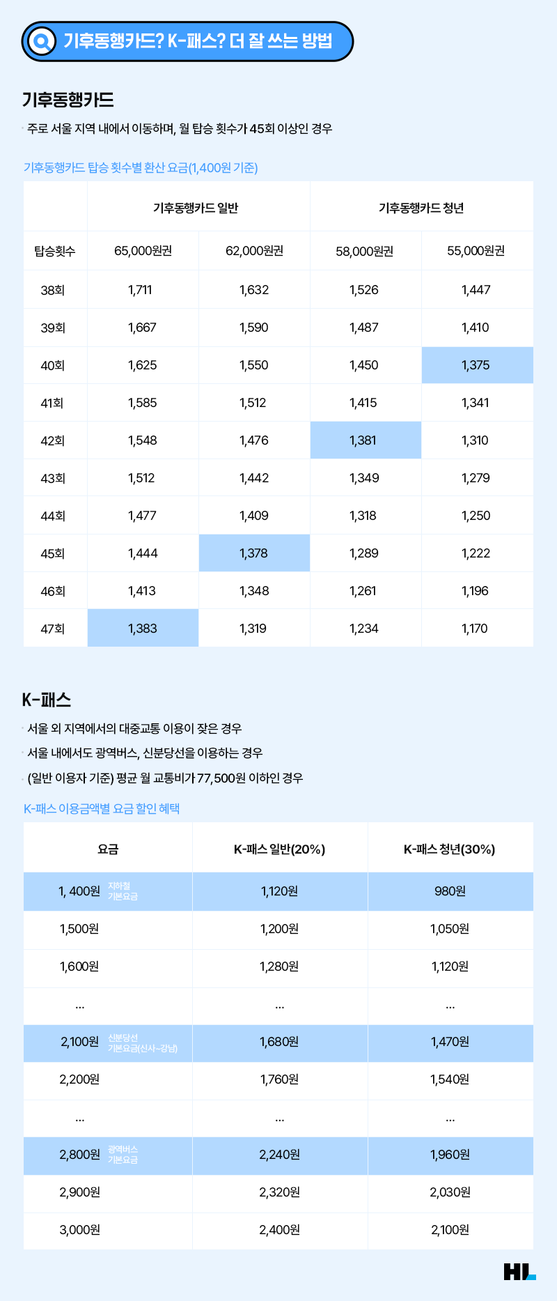 K-패스와 기후동행카드 중 어떤 카드를 사용할 지 고민이라면 K-패스 환급액을 적용한 최종 금액과 기후동행카드의 이용금액이 동일해지는 시점을 기준으로 비교해야 합니다.